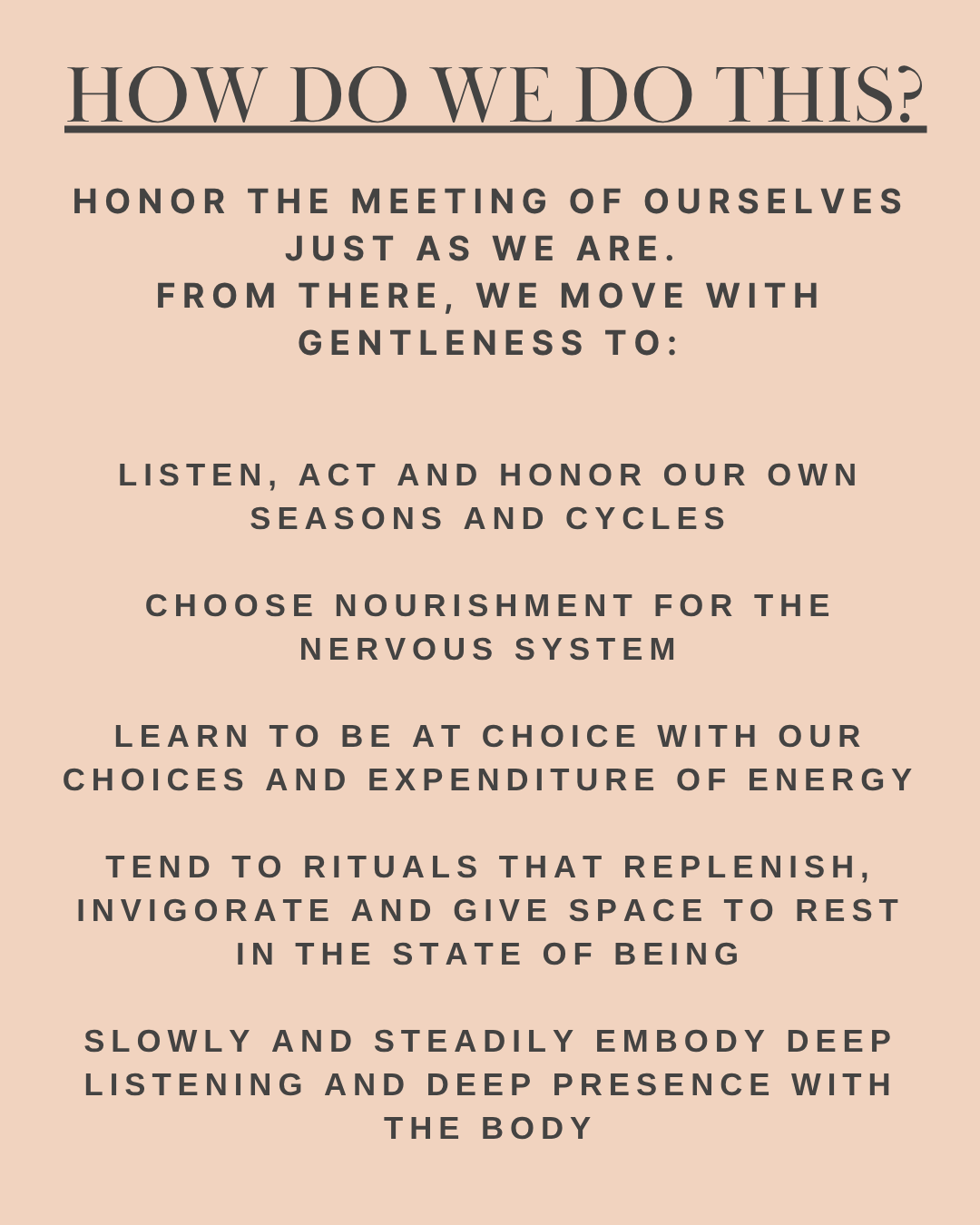 This journey is a culmination of 20+ years working with clients, my own life experiences brewed together through a medley of self-care practices, nervous system nourishment, rituals, breathwork, movement and conversations dedicated to softening, nurturing, slowing down to be present in your body and life and granting yourself permission to follow and honor the guidance of the season you are in.