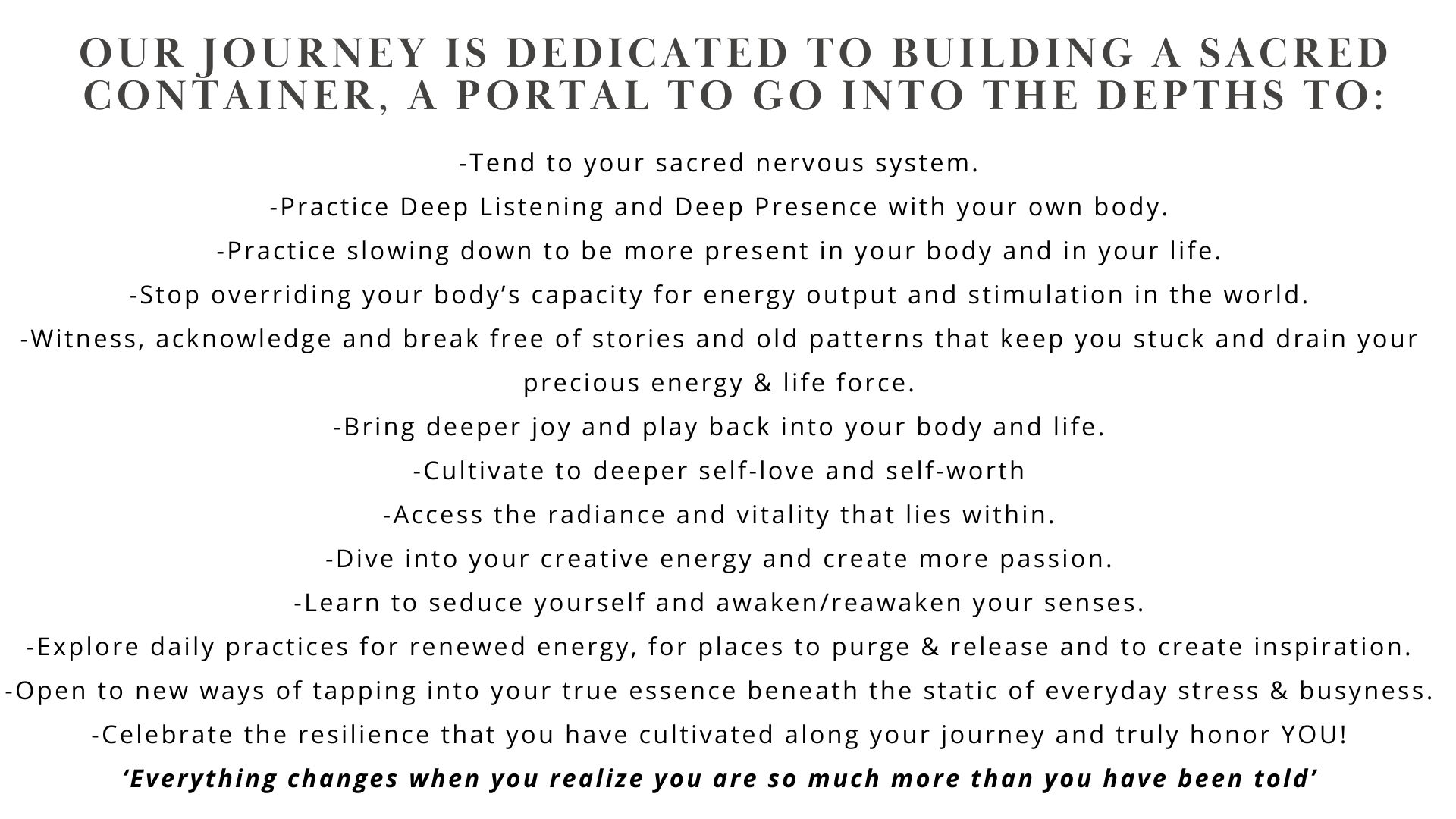 These are intended for you to explore and integrate at your own pace. After all, that is what this journey is dedicated towards: